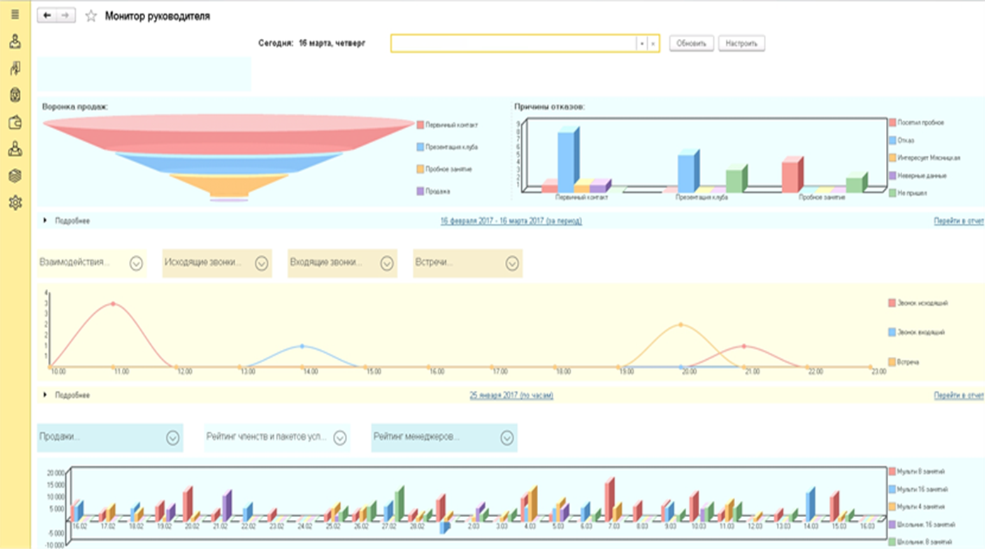 • Блок «руководитель отдела продаж» мониторинг задач по работе с клиентами и их контроль, анализ загрузки клуба, воронка продаж.