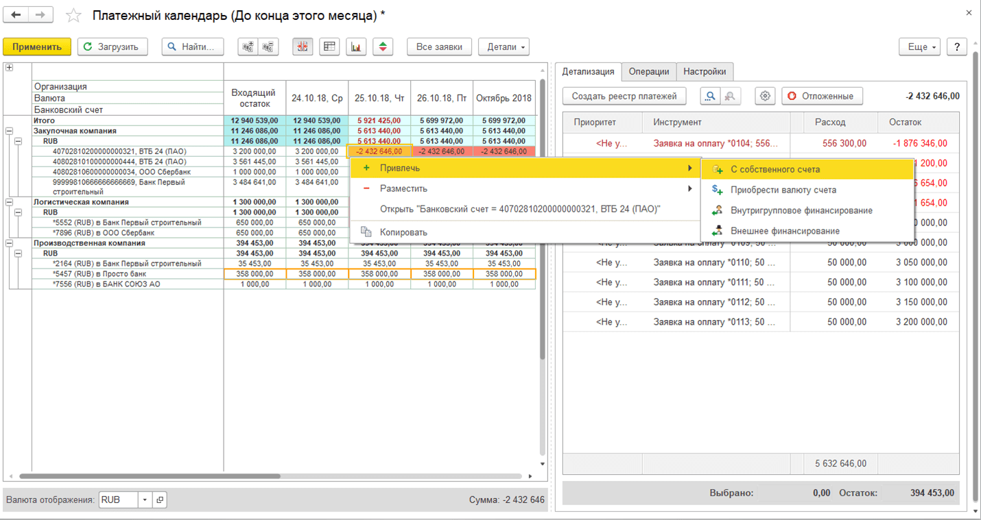 Подсистема "Централизованное казначейство" прикладного решения "1С:Управление холдингом" организована в соответствии с концепцией "фабрики платежей" и обеспечивает укрупненное и детальное планирование денежных потоков, управление мгновенной и краткосрочной ликвидностью, позволяет сочетать централизованную и децентрализованную модели управления денежными средствами холдинга, а также эффективно управлять кредитными, валютными и процентными рисками.