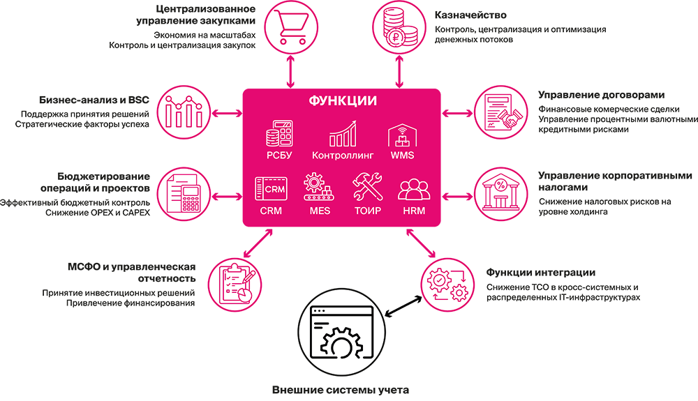 Обновленная версия объединяет в себе функции управления бизнесом, доступные в предыдущей версии 1С:ERP Управление предприятием 2.5., а также функции автоматизации корпоративных финансов 1С:Управление холдингом 3.2.