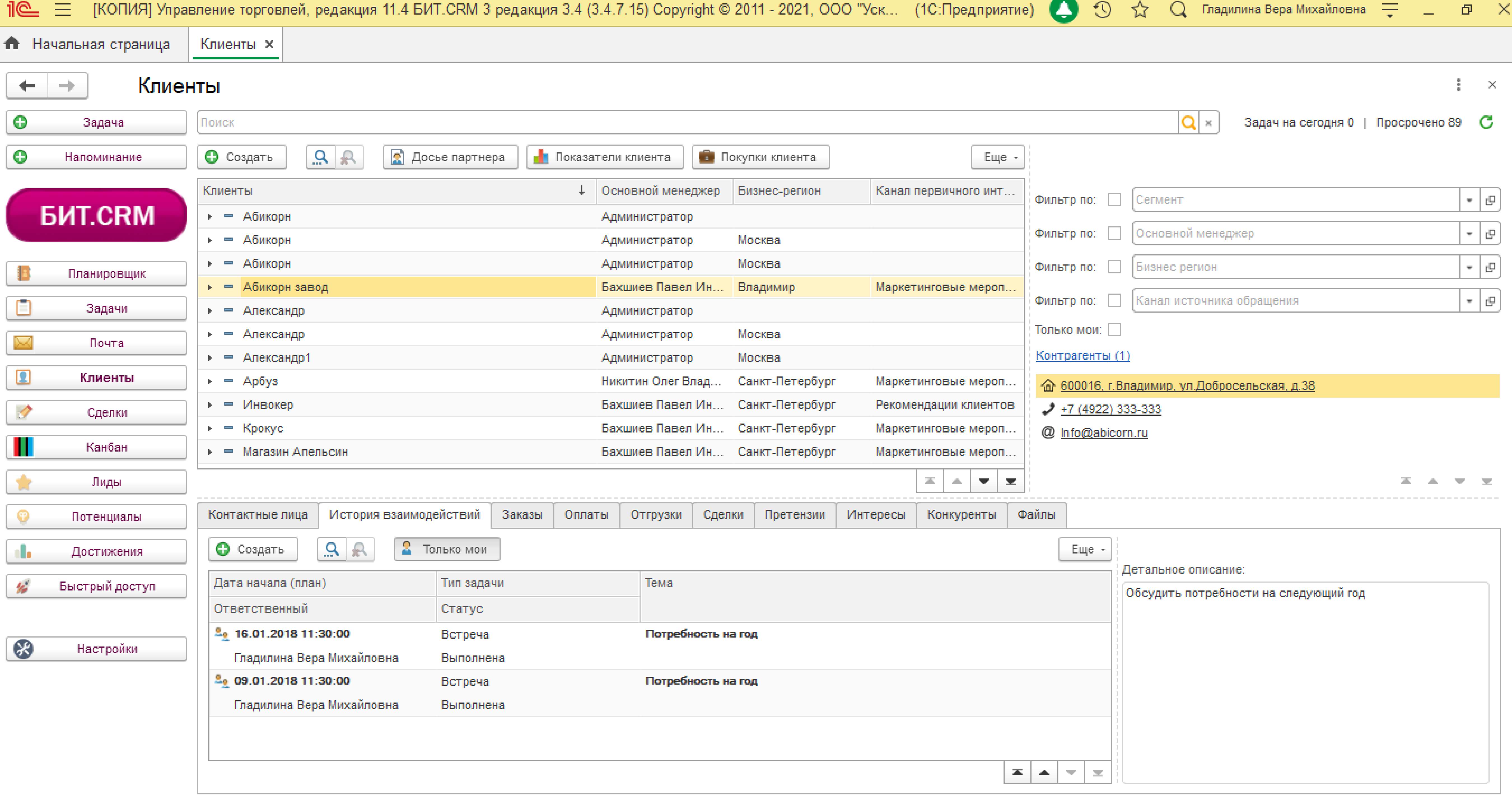 Одной из важнейших функций CRM является сохранение необходимых данных о клиентах в упорядоченном виде. Например, контакты, реквизиты, история покупок, записи разговоров, история взаимодействий, закрепленный менеджер и т. д. На основе этих данных в CRM можно управлять клиентской базой и продажами, сегментировать клиентов по различным признакам, контролировать работу отдела продаж и увеличивать продажи.