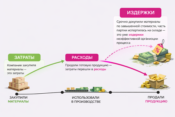 Приведем пример: компания закупила материалы — это затраты; использовала их в производстве и продала готовую продукцию — затраты перешли в расходы; а если из-за плохого планирования пришлось срочно докупать материалы по завышенной цене или часть партии испортилась на складе, это уже издержки неэффективной организации процесса.