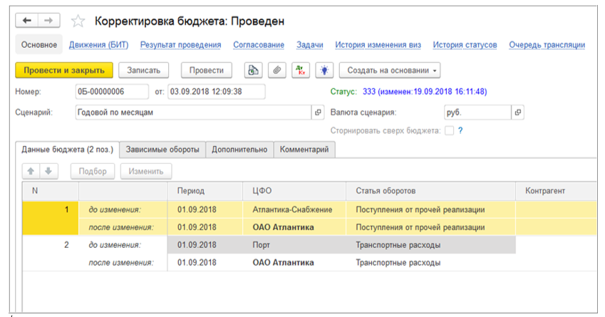 Документы «Корректировка бюджета» и «Актуализация бюджета» позволяют внести изменения, с целью исправления ошибки и с целью актуализации после получения фактических данных.