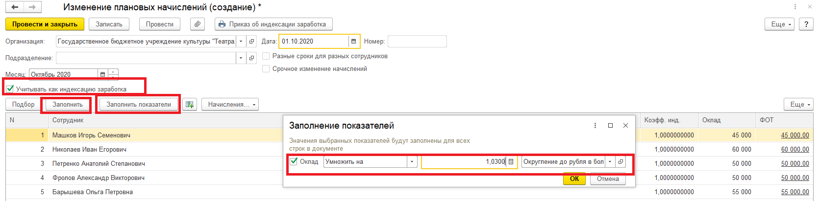 С помощью клавиши «Заполнить показатели», можно подобрать параметры, значения которых следует индексировать методом умножения на коэффициент индексации. В нашем примере мы умножаем Оклад на коэффициент 1,03. В соответствии с новой величиной оклада будет определяться плановый ФОТ работников.