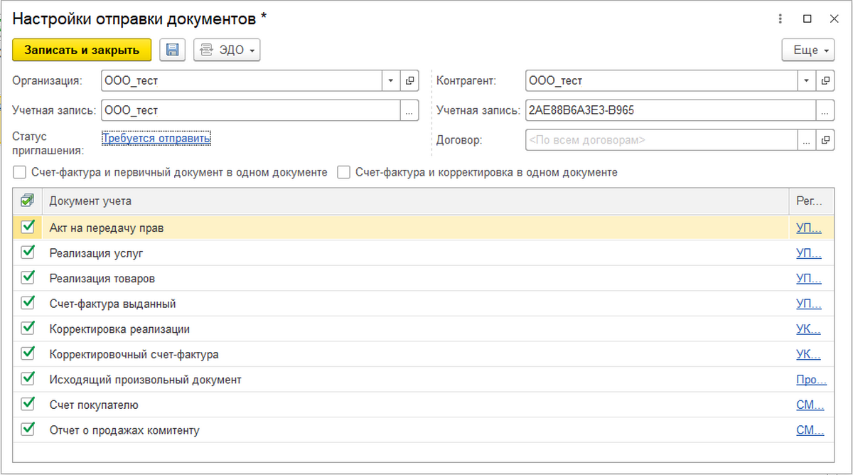 Стоит отметить, если документооборот был настроен по заявлению, то есть был произведен «ручной» роуминг, то выставление настроек и отправка приглашения через 1C не нужна. Они будут созданы в системе в автоматическом порядке.