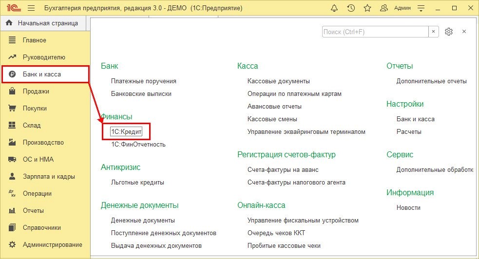 Для использования сервиса 1С:Кредит нужно зайти в раздел «Банк и касса», затем в блоке «Финансы» выбрать 1С:Кредит.