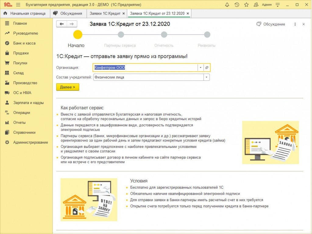 1С:Бухгалтерия 8 ред. 3.0 имеет функционал, на основании которого компания или ИП может быстро сформировать заявку на кредит прямо в самой программе. Для этого используется 1С:Кредит, который применяется по всей территории России. Компания 1С постоянно увеличивает количество партнеров, которые подключены к данному сервису, например, банки, МФО и т.д.