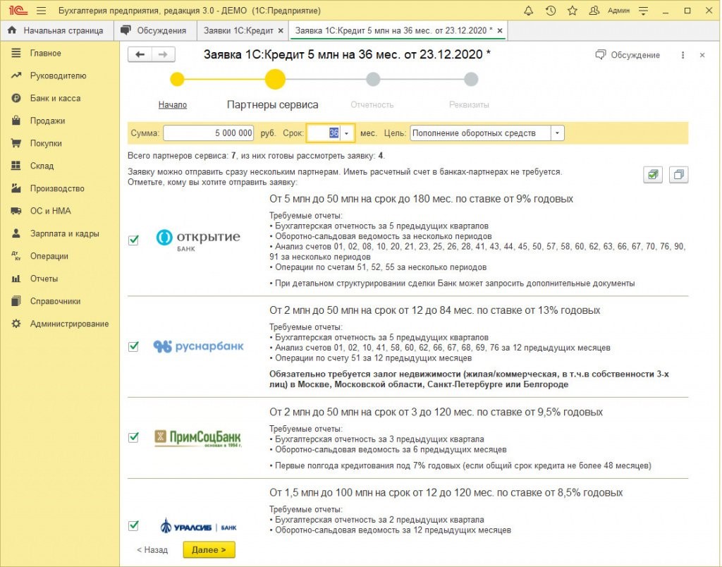 Пользователю показывается перечень партнеров, которые подключены к 1С:Кредит и готовы рассмотреть запрос на получение кредита. По каждому партнеру отражаются условия предоставления заемных средств. Пользователь может отправить заявку сразу нескольким партнерам, для чего они отмечаются флажками.