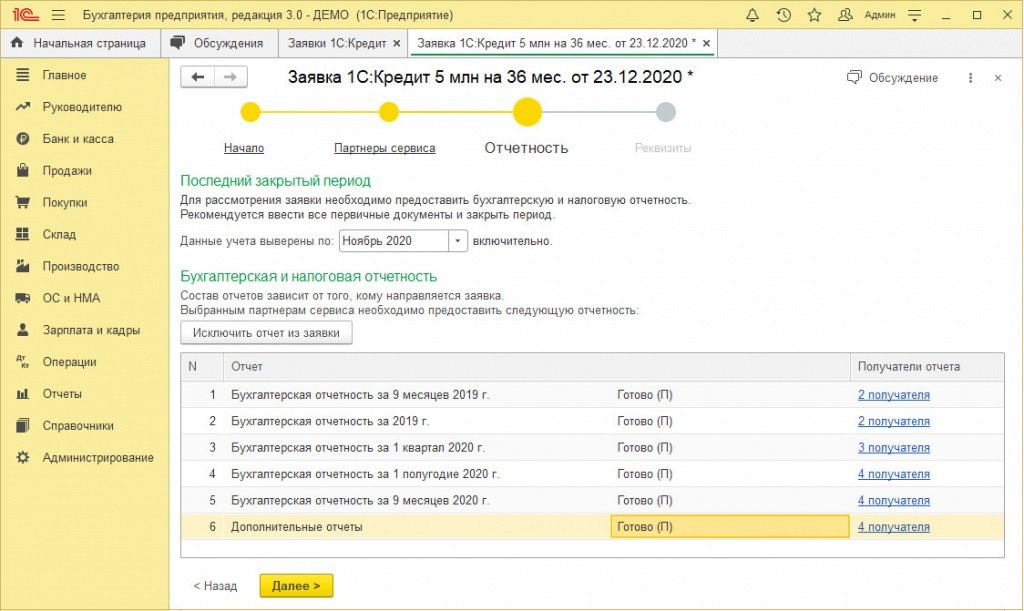 В 1С:Бухгалтерии 8 ред. 3.0 есть сервис 1С:Кредит, на основании которого можно по упрощенной схеме заполнить заявку на кредит. Документ создается автоматически, и его можно сразу направить партнерам.