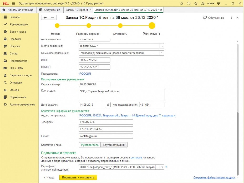 Также в заявке на кредит нужно проставить сведения о руководителе юрлица или ИП – место рождения, ИНН, СНИЛС, гражданство, паспортные данные, контакты. Именно на него должен быть оформлен квалифицированный сертификат ключа проверки ЭЦП.