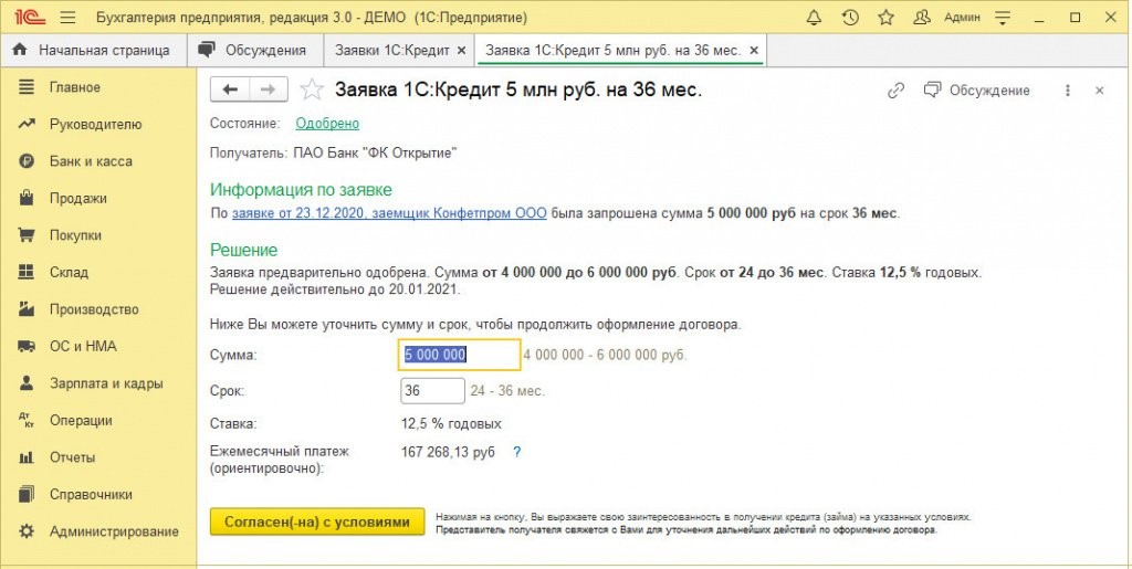При открытии заявки пользователь увидит решение банка, и здесь же он может уточнить сумму кредита и срок его получения, но только в пределах значений, предложенных партнером. Если условия устраивают, необходимо направить партнеру извещение через кнопку «Согласен(-на) с условиями». Затем представитель банка самостоятельно свяжется с заемщиком, чтобы уточнить дальнейший порядок действий.