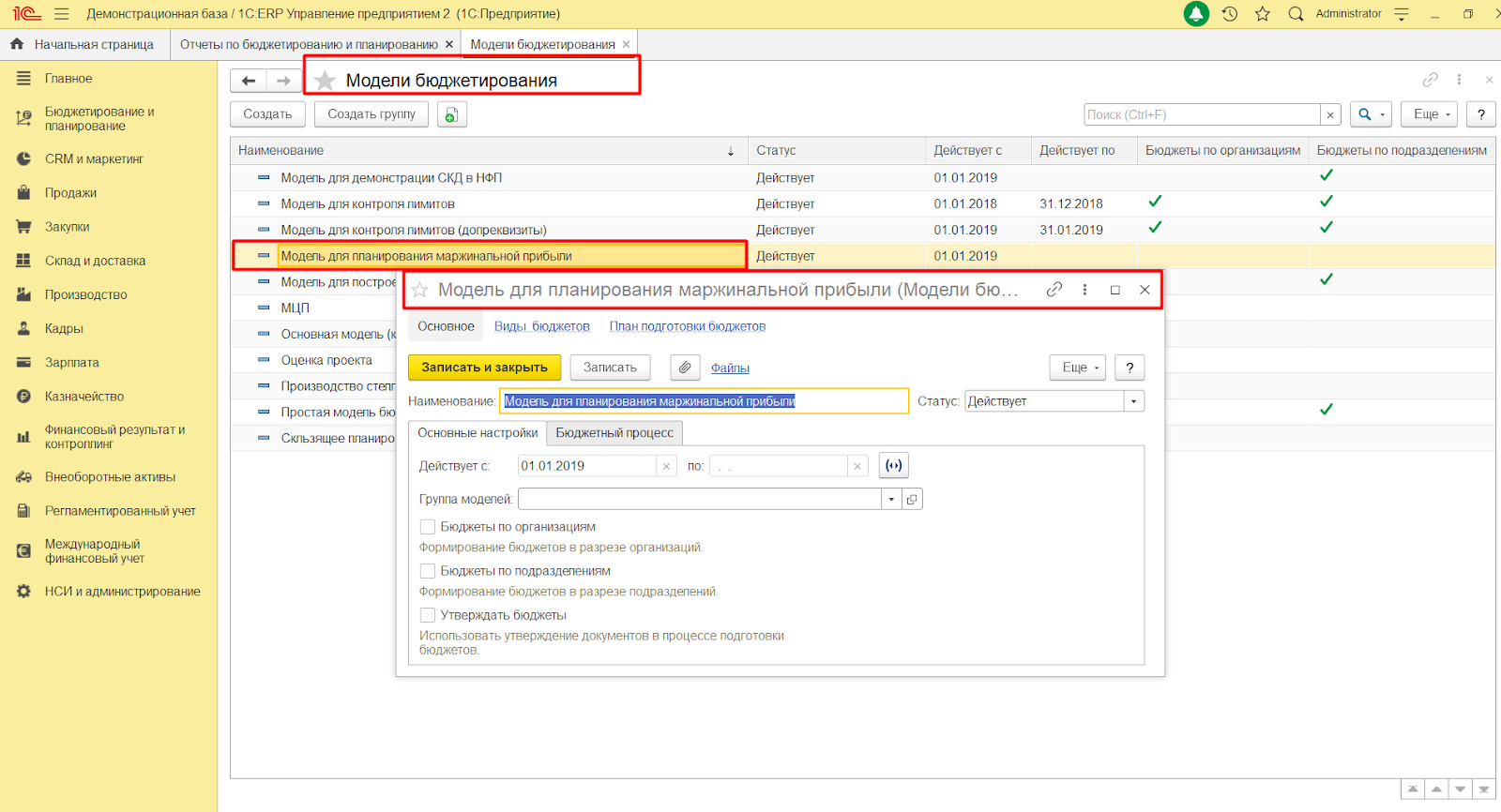 Чтобы спрогнозировать прибыль в 1С:ERP, пользователь может использовать справочник «Модели бюджетирования». Он применяется, чтобы регистрировать и настраивать любые модели бюджетирования для прогнозирования различных показателей, в т.ч. и прибыли. К примеру, можно использовать «Модель для планирования маржинальной прибыли».