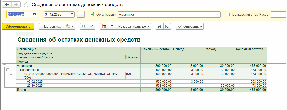 • Контроль остатков денежных средств на расчетных счетах и в кассах организации.