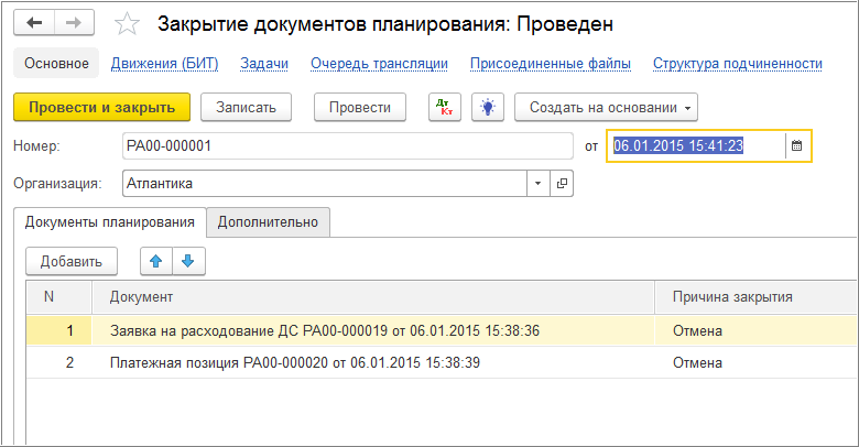 В случае изменения планов или отказа от оплаты предусмотрен механизм закрытия документов планирования. Закрытые заявки автоматически исключаются из планируемых расходов, а система фиксирует причины закрытия. Это позволяет поддерживать актуальность платежного календаря и управленческой отчетности без ручных корректировок.