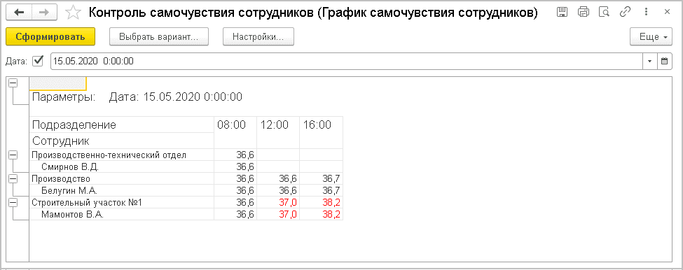 Красным цветом будут акцентироваться данные о превышении температуры от 37 градусов Цельсия. Отсортировать информацию можно по величине температуры, подразделению фирмы, периоду.