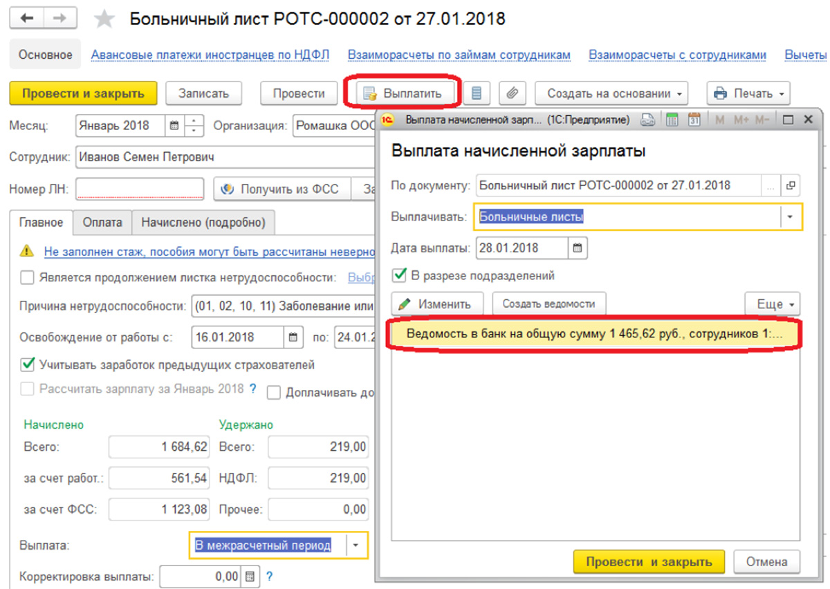 В графе «Выплата» требуется указать - в межрасчетный период. После нажатия кнопки «Выплатить» появится ведомость, которой присвоена опция «Больничные листы».