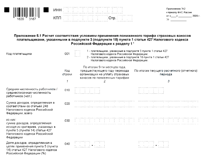 Дополнительно в первый раздел включено приложение 5.1 «Расчет соответствия условиям применения пониженного тарифа страховых взносов плательщиками, указанными в пп. 3 (пп. 18) п. 1 ст. 427 НК РФ». Оно понадобится компаниям, которые: