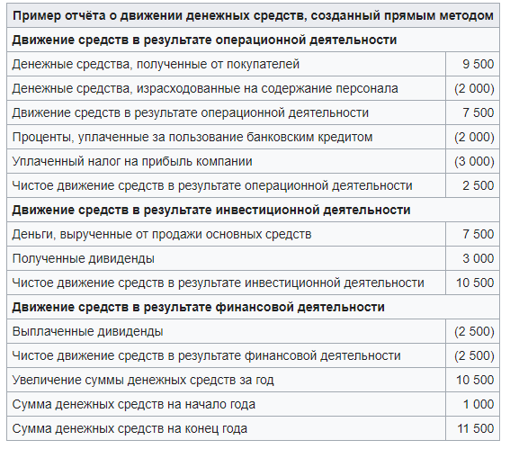 При прямом способе формирования используются данные по основным видам валовых поступлениях и выплатам денежных средств.