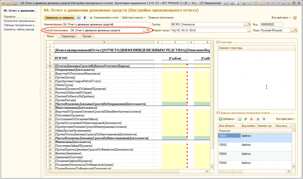 - В пользовательском режиме можно настроить отчет в форме любого фиксированного макета. Это может быть необходимо в случае, если требуется отчётность по форме МСФО. Так как некоторые стандарты не имеют единой формы отчетов, разные компании строят их по-разному.