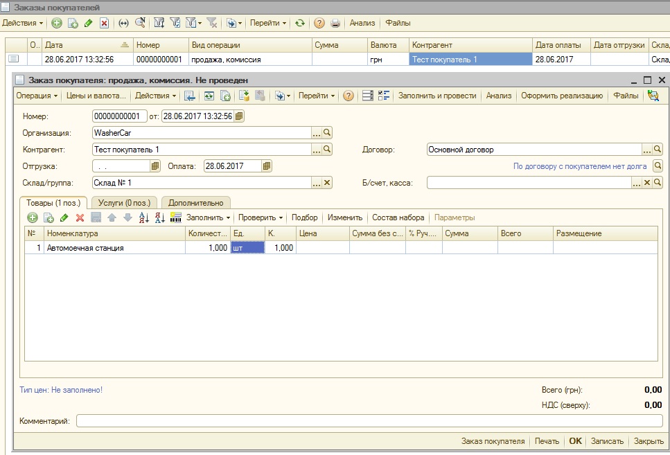 - Первое, что требуется сделать - создать заказ покупателя. В него требуется добавить позицию номенклатуры, которая выступает готовым изделием. Оно предназначено для оплаты покупателем счета на оплату. Нужно понимать, что в данном случае именно заказ покупателя выступает стартом всего рассматриваемого процесса. С этого момента на базе заказа клиента требуется создать заказ на изготовление и таким образом запустить бизнес-процесс.