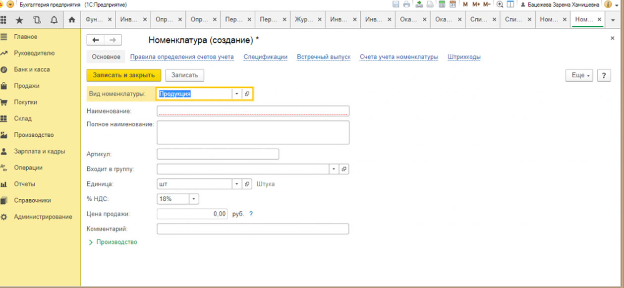 Чтобы внести данные, потребуется нажать кнопку «Создать», после чего в справочнике «Номенклатура» выбирается конкретное изделие - кожаные черные сумки устанавливается количество изготовленных за смену единиц и плановую предполагаемую стоимость изделий (фактические результаты по стоимости рассчитываются по окончании месяца после того, как будут проведены все регламентные операции).