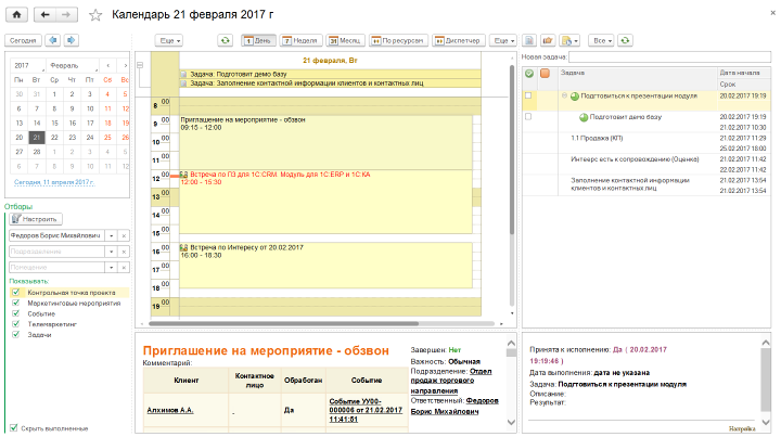 - Учет рабочего времени. С помощью синхронизированного календаря значительно облегчается процесс планирования. Сотрудник самостоятельно может контролировать свои трудозатраты на те или иные задачи. Планировщик помогает распределить дела и поставить напоминания. Благодаря этому исключаются случаи, когда менеджер забыл отправить документы или вовремя перезвонить клиенту.