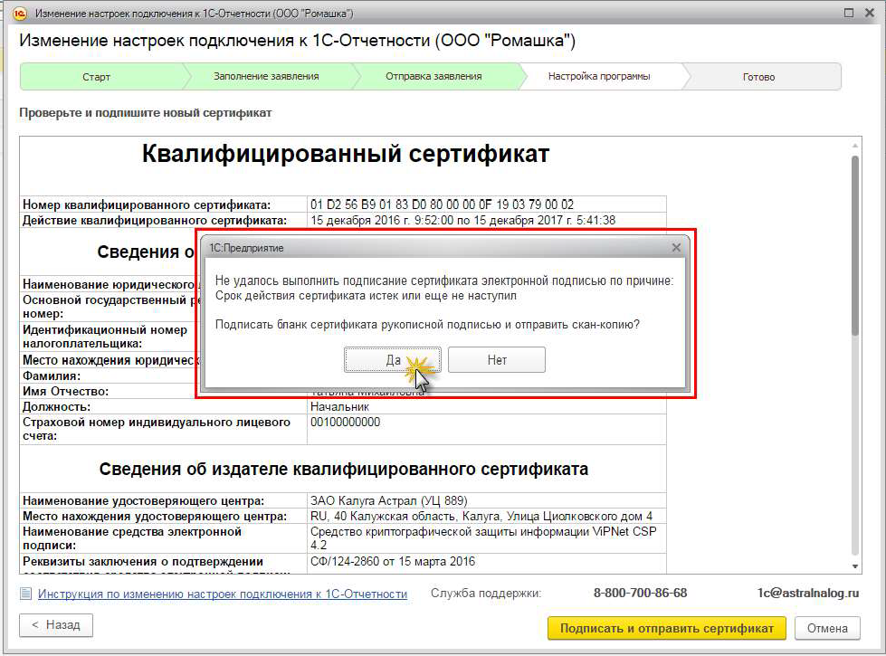 Если к моменту настройки прежний сертификат прекратит свое действие, что сделает невозможным использование его для подписания, программа выведет на экран соответствующее сообщение. В этом случае необходимо распечатать бланк сертификата, подписать его рукописной подписью и отправить скан-копию документа.