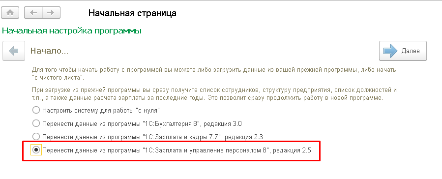 - Затем выбрать вариант переноса данных в «1С:ЗУП» 3.1.